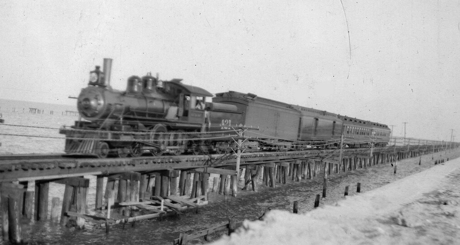 Train crossing a low trestle.