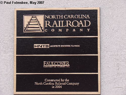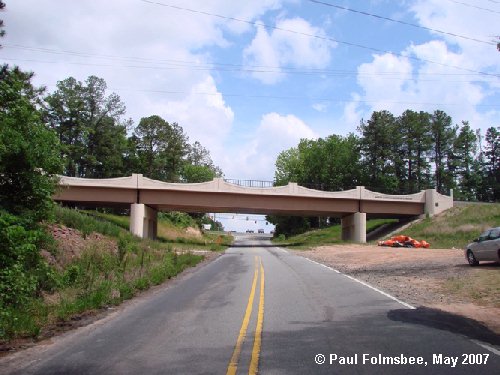 In May 2006, the North Carolina Railroad completed construction of a new bridge carrying their tracks over North Carolina Highway 54 at the dividing line between Research Triangle Park and Durham. This beautiful new concrete bridge is double-tracked and replaced a narrow single-track bridge which had substandard clearance. Paul Folmsbee took these photos of the new bridge during and after its construction. The center of the old bridge was the dividing line between the cities of Research Triangle Park and Durham. The new bridge is 75 feet west and lies totally within Research Triangle Park.