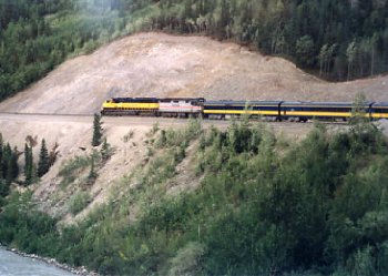 Alaska Railroad passenger train southbound from Fairbanks to Denali. Note the Amtrak loco behind the Alaska Railroad loco. |