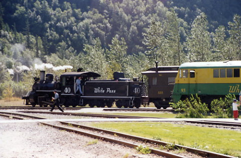 WP&YRR Baldwin 2-8-0 Consolidation #40 under steam and ALCO 251B #93 at Skagway. |