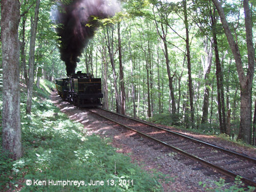 #4 emits a heavy smoke cloud as she strains up the grade.