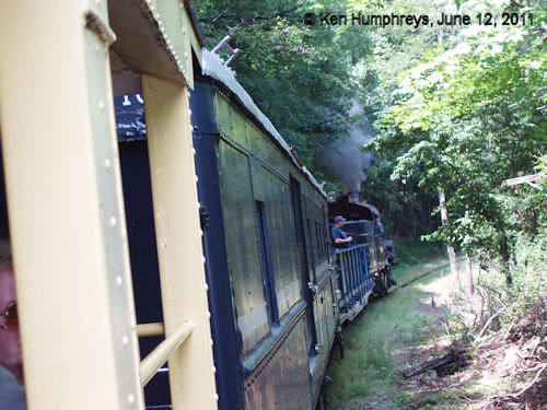 Rear of the train at the end of the line, a good location for a picnic or for fishing in the river.
