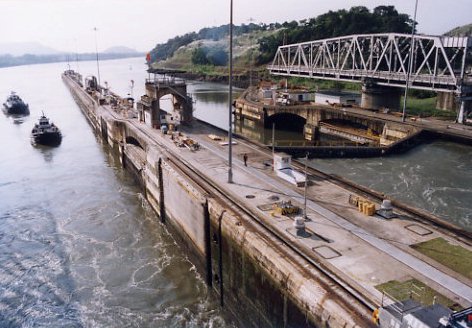 The very close clearance between the lock wall and the ship is evident in this photo.