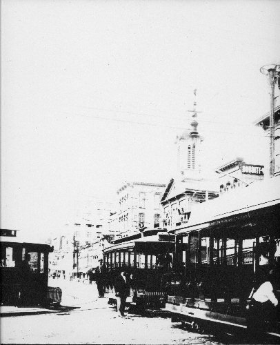 trolleys on Fayetteville Street in Raleigh, circa. 1900. The photo