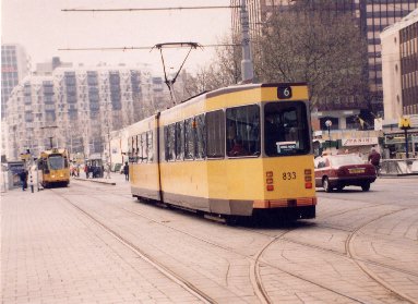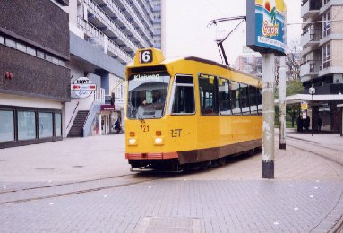 Rotterdam was virtually destroyed during World War II and has been completely rebuilt and modernized. Major streets are much wider that those of most European cities, however narrow-bodied trams remain. The difference is that they run on private right-of-way in the center of the major roads with automobile and truck traffic in separate lanes on each side of the tram tracks. Apr. 1998 photos.