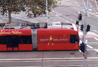 Sydney is a modern city of wide streets and uses standard rail gauge for its trams. Sydney operates long, articulated trams five sections in length. As is the case in many cities, the trams of Sydney are moving billboards carrying all manner of advertising. Depicted here are two trams, one advertising Johnnie Walker Red Label Scotch whiskey and one advertising MasterCard. The Johnnie Walker tram is appropriately painted red. April 2002 photos.